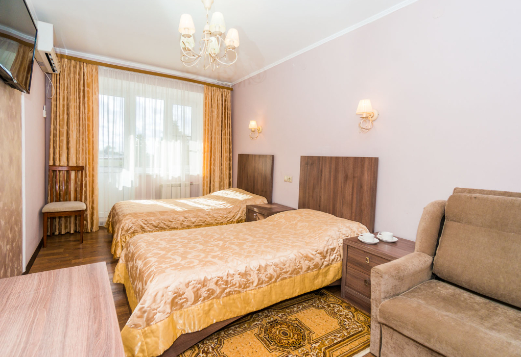 Площадь номера - 12 кв.м. 1 комната. 2 осн. места. номера расположены с 1 по 3 этаж. В номере: телевизор; балкон; кондиционер; телефон; умывальник; туалет; фен; Wi-Fi; стул; 1-спальные кровати; журнальный столик; зеркало; мини-холодильник; душевая кабина; шкаф; прикроватная тумбочка; сушилка для белья. 1 доп. место: Кресло-кровать - может быть установлено без ограничения по возрасту.