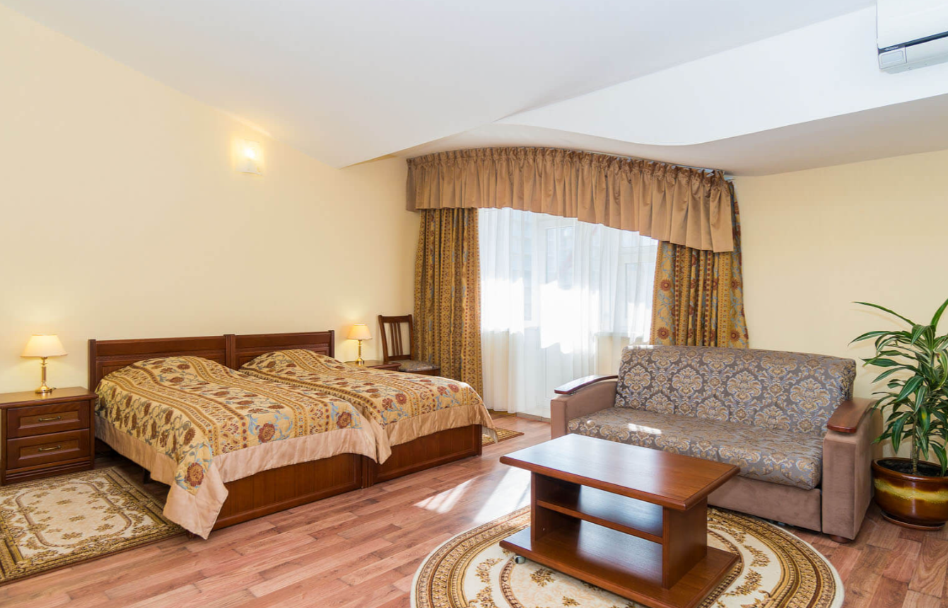 Площадь номера - 30 кв.м. 2 осн. места. 2 доп. места. Балкон. Мебель: вешалка, диван, зеркало, кресло-кровать, кровати односпальные /одна двуспальная кровать, прикроватные тумбочки, столик журнальный, стул, тумба, шкаф. Оборудование: кондиционер, телевизор, телефон, холодильник, электрочайник. Санузел: с душем, туалетные принадлежности, фен. Сервис: Wi-Fi бесплатно, смена полотенец, смена постельного белья, уборка номера.